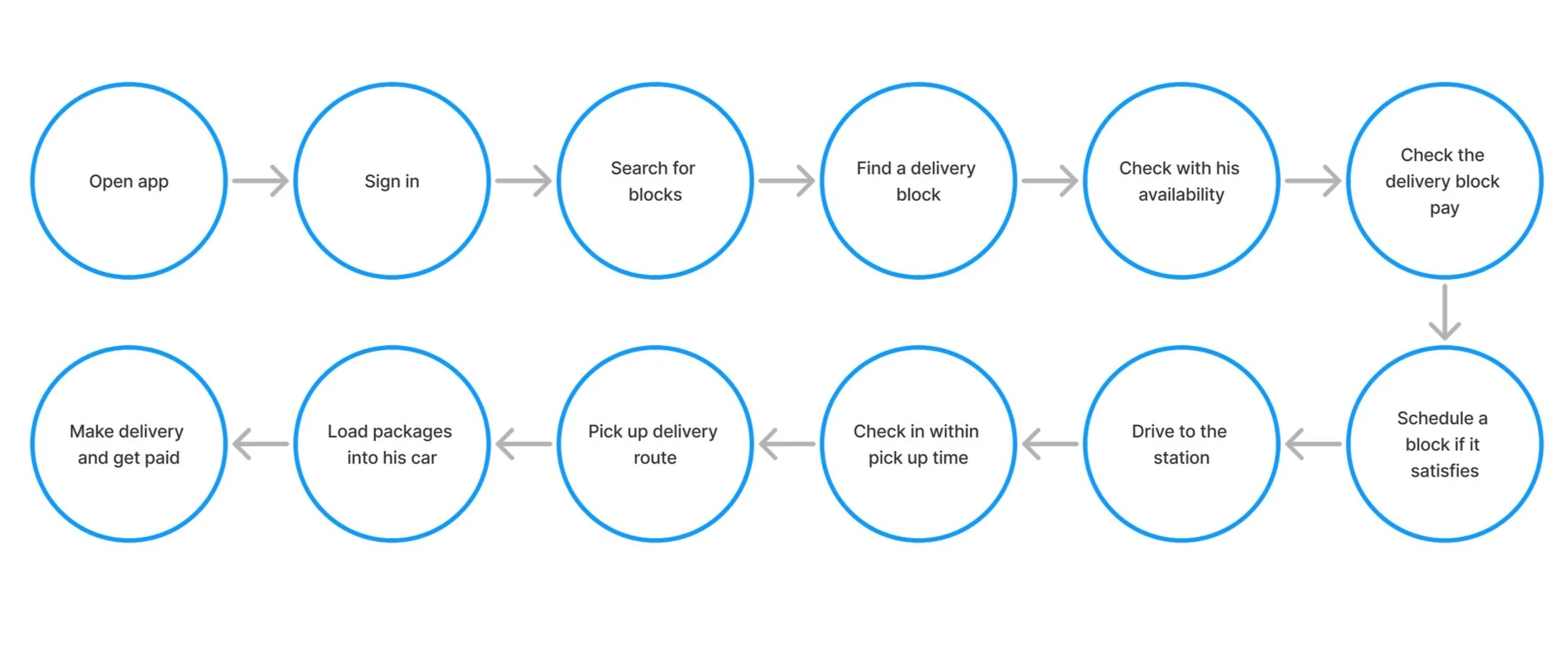 It is research that prevents us from designing for one user: ourselves. I’ve conducted thorough focus group interviews with 25 active Amazon Flex program drivers who are delivering or want to earn more with the program. Before getting started with the interview, I’ve pictured the current amazon flex’s user flow and crafted the questions along with it.
